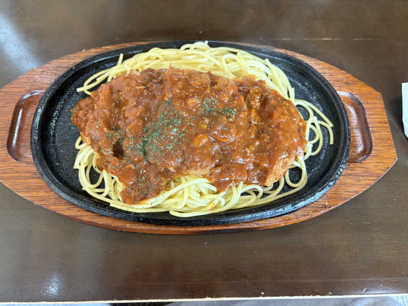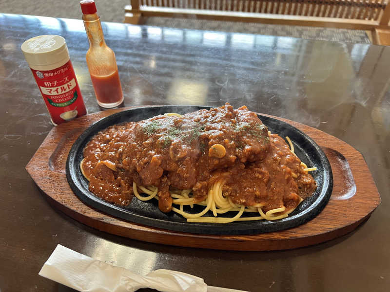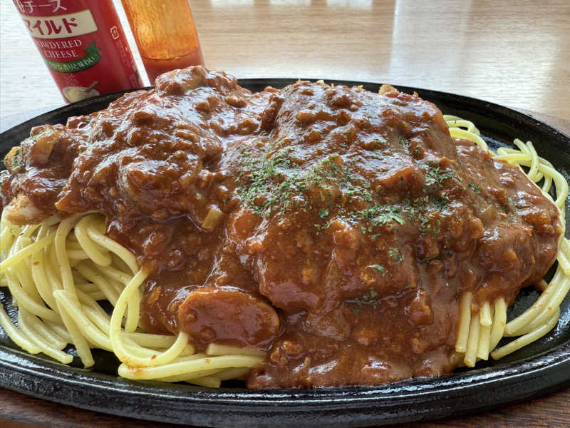 サ室内チラシのおすすめサ飯。迷わず注文。熱々の鉄板でトマトソースがグツグツ、こりゃうまい😋🍴