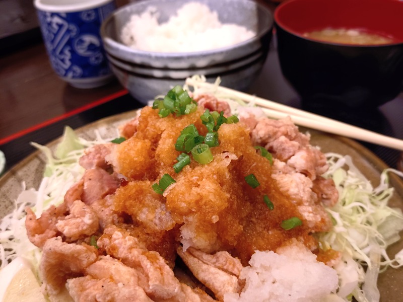 普通の一口大サイズのから揚げでなく、一枚のモモ肉をから揚げしたタイプ。 上におろしが、乗っている。