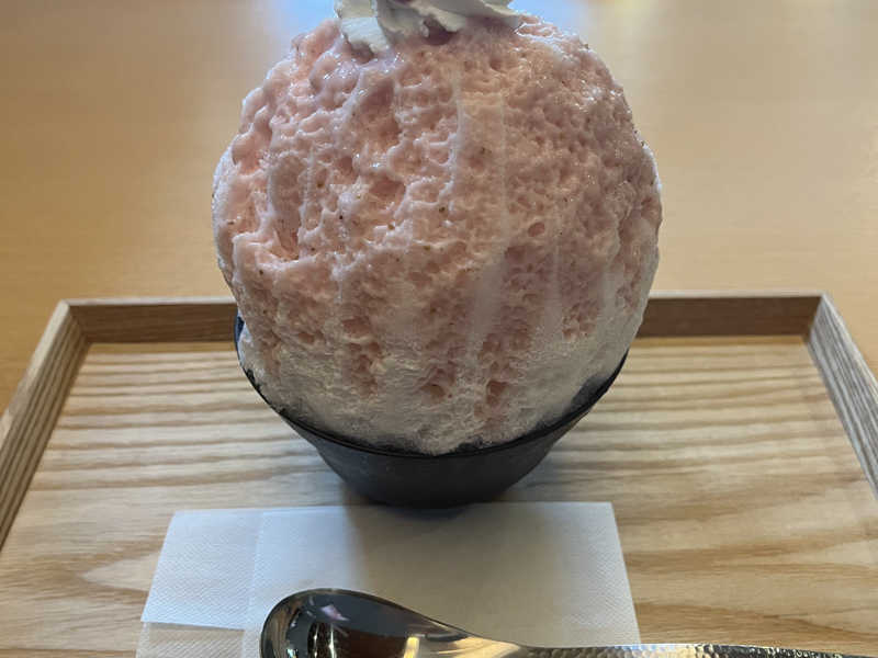 サウナ終わりは、4月から発売が始まった「越のゆグループ × オクノシブヤ コラボ」のサ氷を堪能。6月下旬までの限定発売の「ととのい生イチゴミルク」は、頭が痛くならないふわふわのかき氷でサウナ終わりに食べるにはちょうどいい。