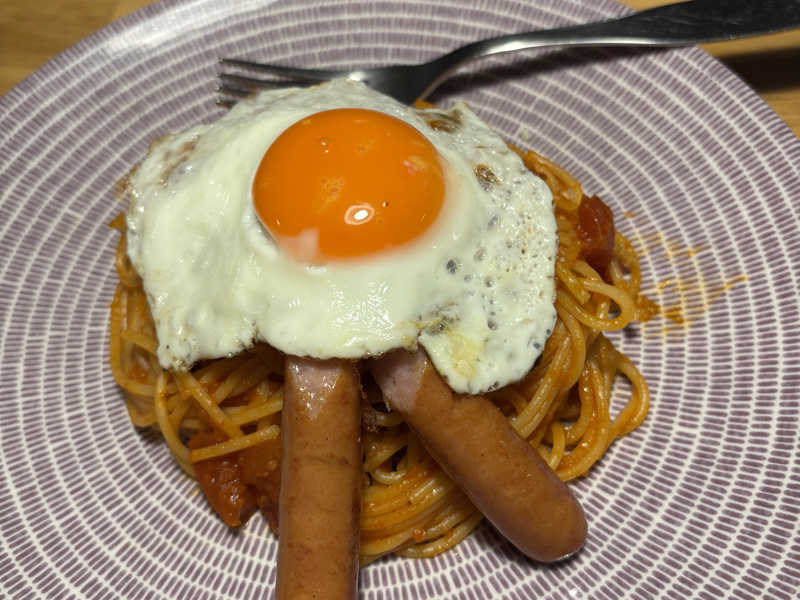 目玉焼きが、光っている✨ 濃厚ケチャップに太麺のパスタ 映える(笑)