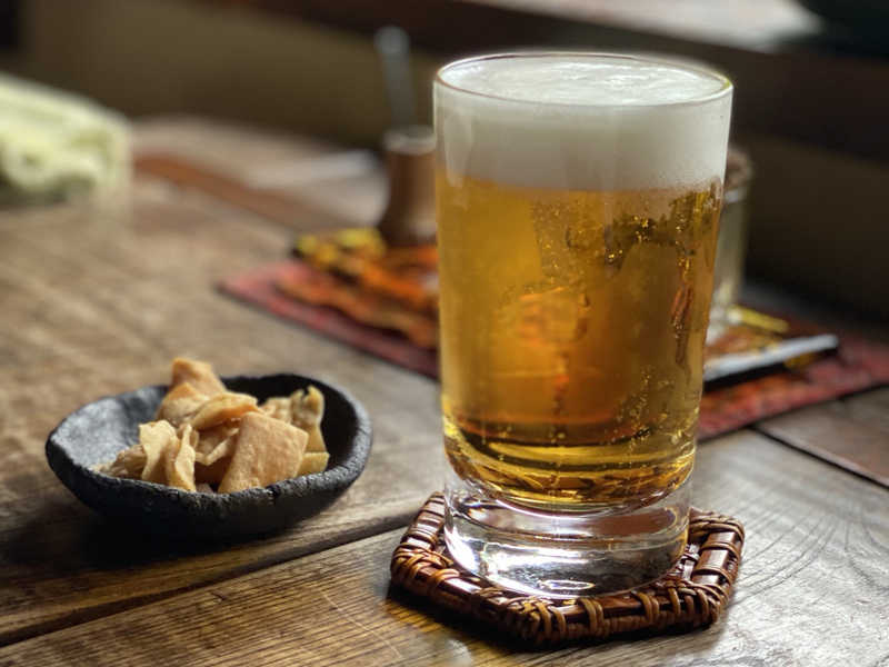 スタジアム、禅と堪能して1時過ぎに一休み。遅めの昼飯は、生ビールと串揚げ。サウナ後のビールは最高だ。