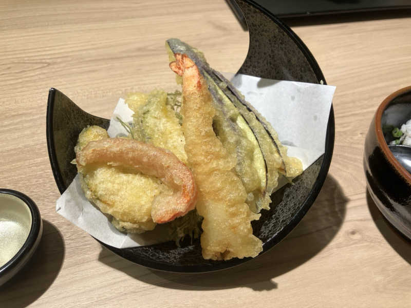 夏野菜たっぷり、揚げたてで美味しい。レモン塩がついてきた。味変に天つゆも欲しかったかも!