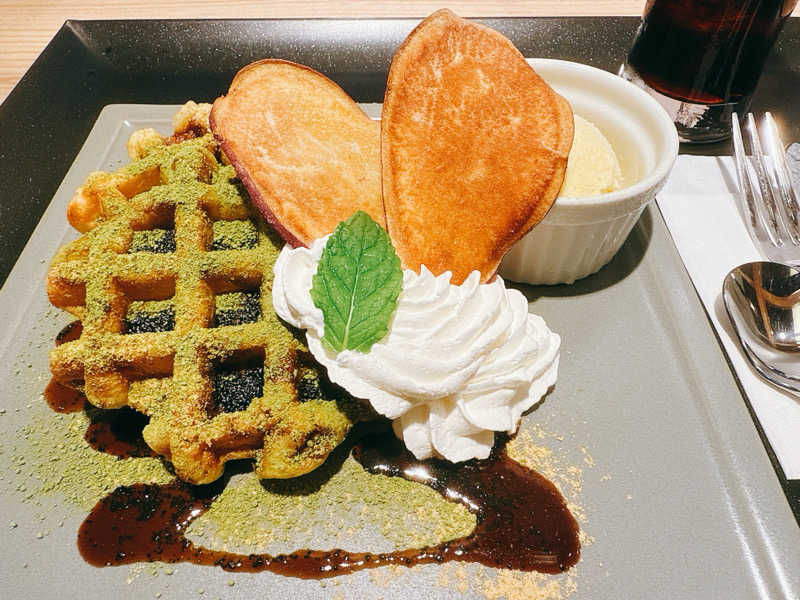 もちもちワッフル🧇 抹茶ときな粉と黒蜜がけ 生クリームとバニラアイスを 揚げ🍠さつま芋で頂き美味し😋