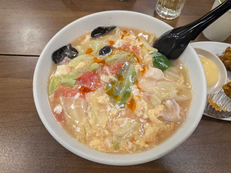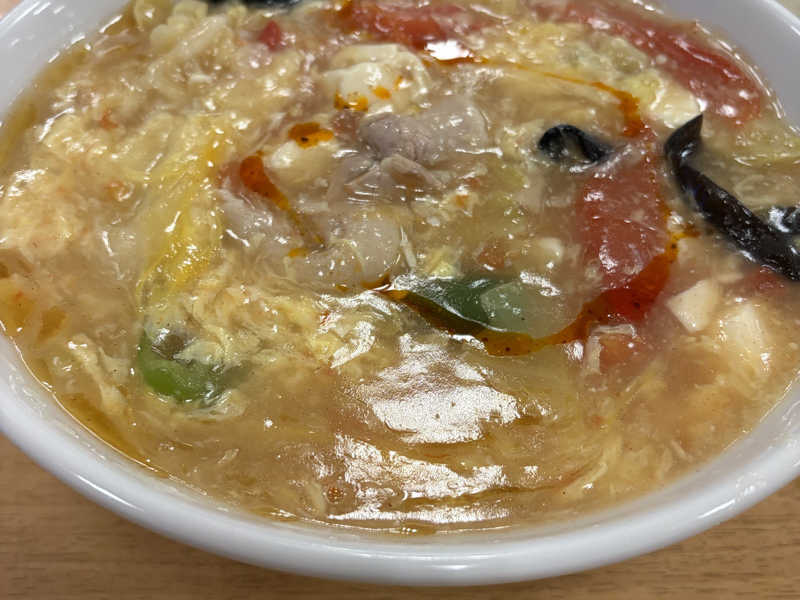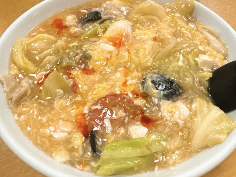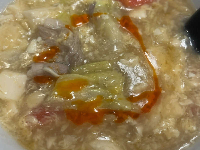 野菜に豆腐に豚肉。具だくさん。ぼったり餡が最後までアツアツに。あれ、もしかしてトレーニーにも最適!?