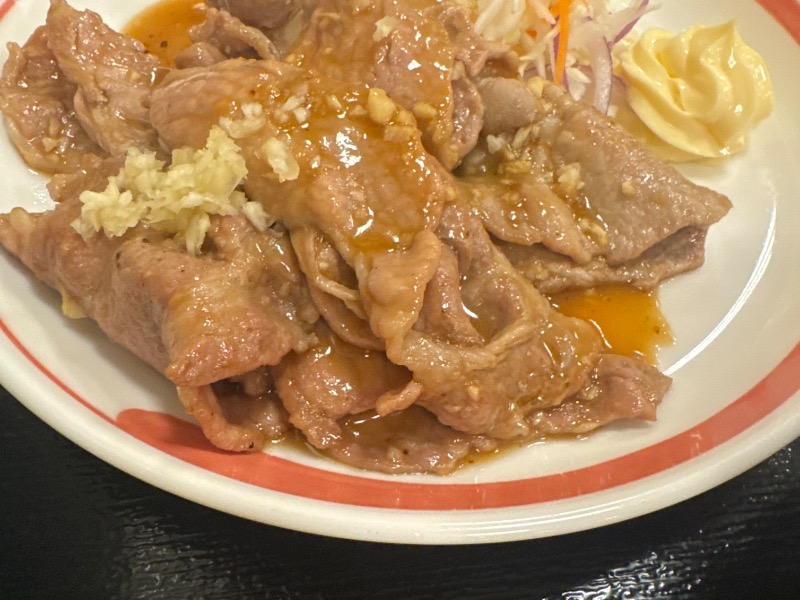生姜焼きをにんにくにした感じ。肩ロースを6枚使っているそうで、かなりのボリューム。サウナ後には最適!