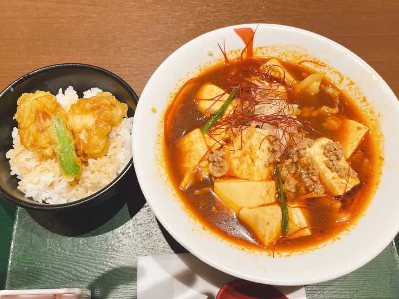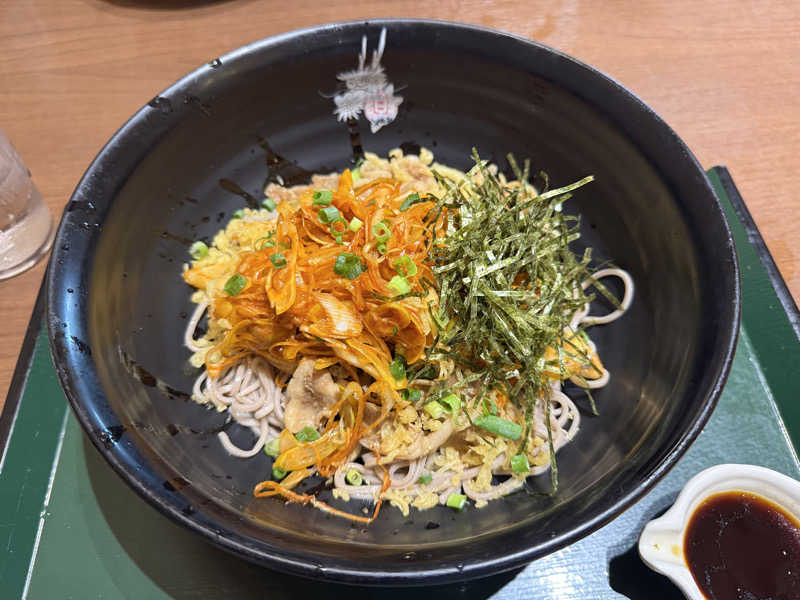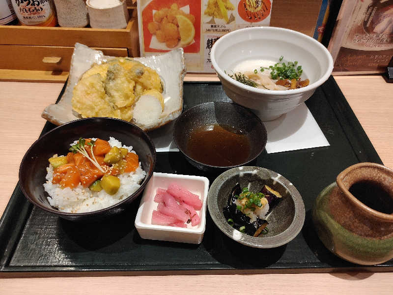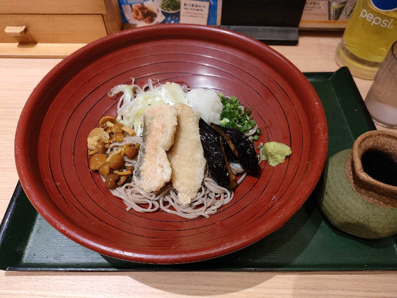 冷たいそばうまー。サーモンと揚げナスとなめこの共演。秋限定メニュー。量が控えめでもっと食べたい。