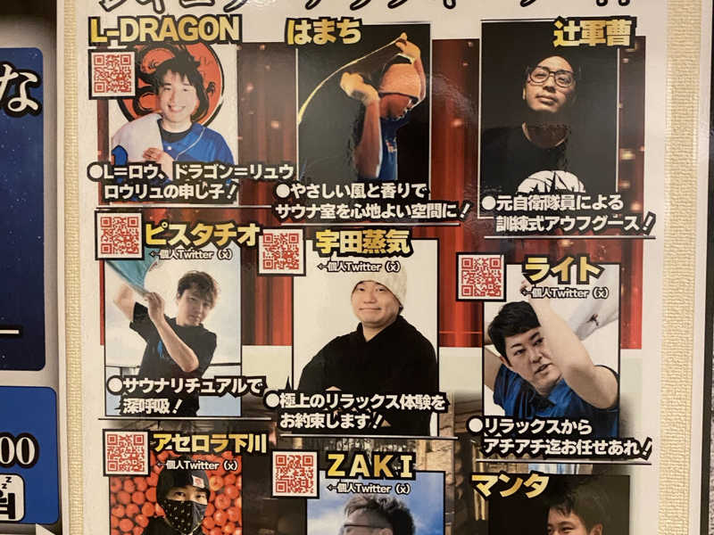 スタイル:タオル 宇田蒸気、ブレンディ小山、辻軍曹、ライト、ZAKI、マンタ、アセロラ下川、ピスタチオ、はまち、ピスタチオなど、多彩なアウフギーサーにより土日中心に定期開催。 3と9の付く日は19:39より39アウフグース開催(平日のみ) 詳しくはバーデンガーデン公式Xを確認 |