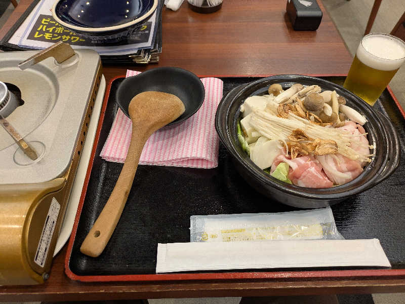 キャベツと豚肉、豆腐、ニンニクチップなど。濃厚な味わいで美味い。ビールの苦味が消えたら食べ頃。