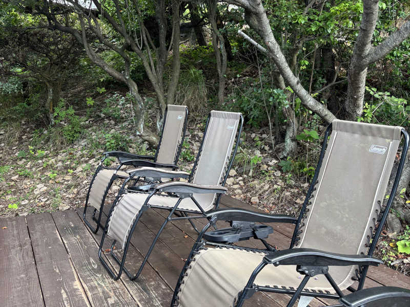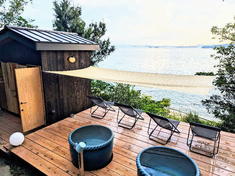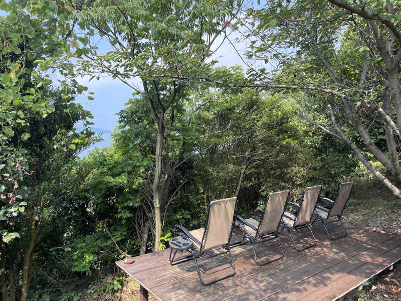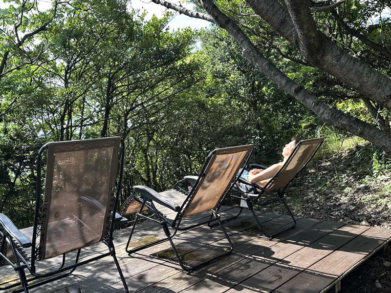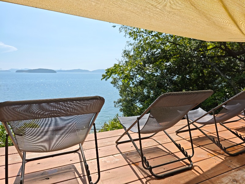 ・水風呂の後はリクライニング整いイスで整い。外気温はそこそこ暑かったですが、自然の風と瀬戸内海一望しながら整うのは別格でした。