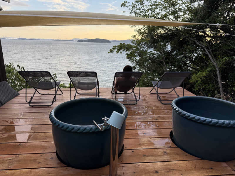 石の階段を少し降りたところに信楽焼の露天壺水風呂があり、こちらからもまた瀬戸内海を一望できる。一人用の壺から一層の特別感をもたらす。