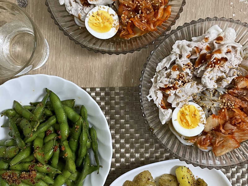 盛岡冷麺、ポテトとガーリック枝豆(つまみ) お家で居酒屋メニュー