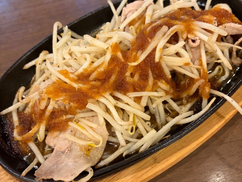 もやしの中にお肉が隠れてました。ご飯が進む。地味な色味のメニューゆえ盛り付けがもう少し丁寧だと嬉しい