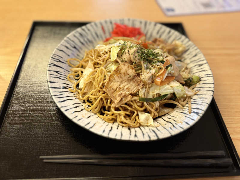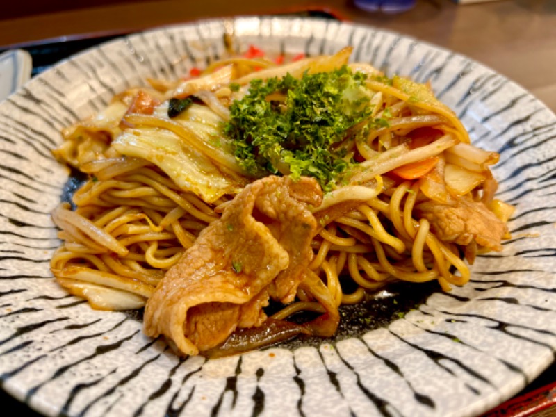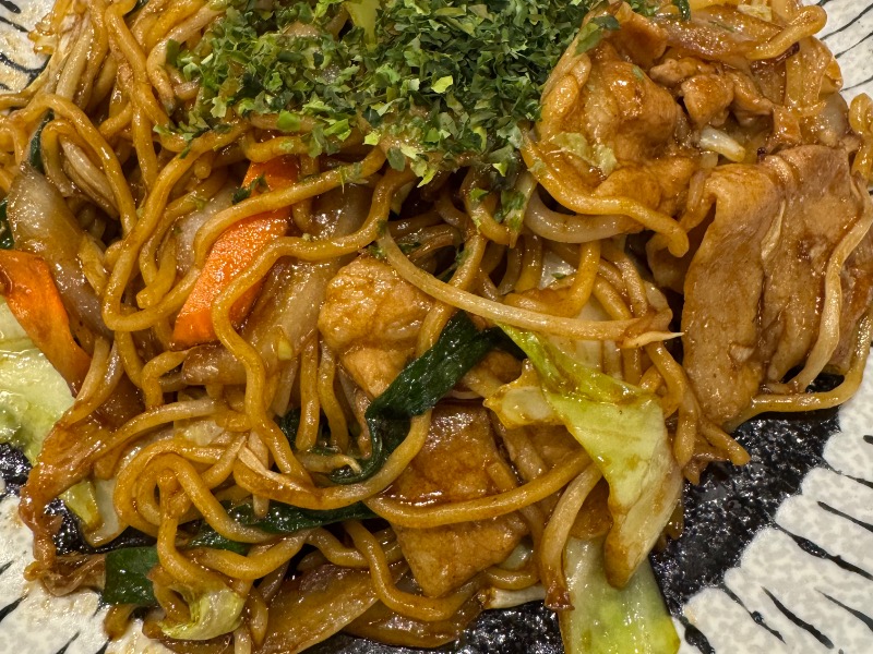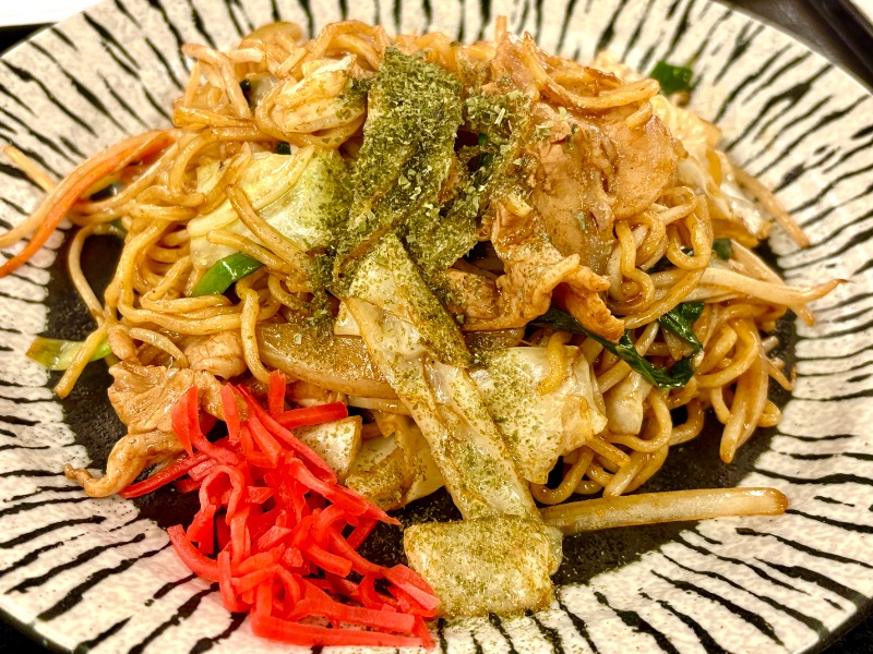 野菜たっぷりの食べ応えある焼きそば。ビールにもよく合う