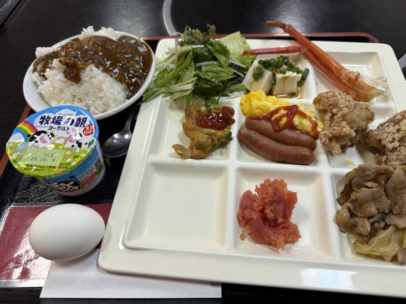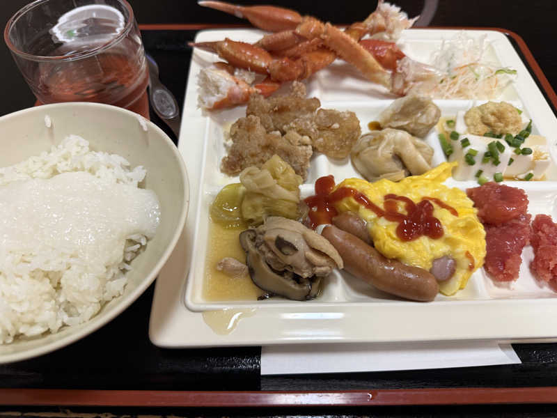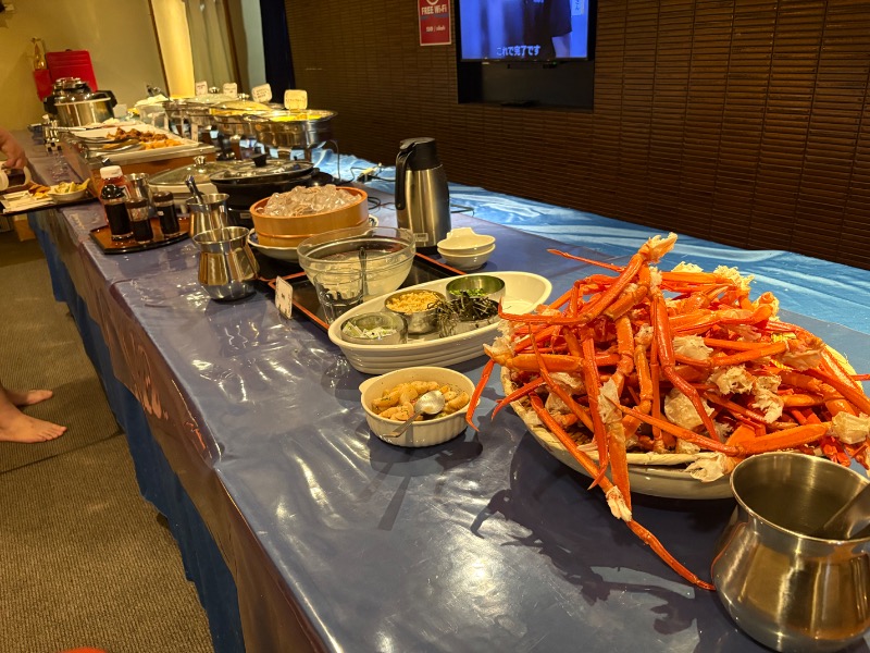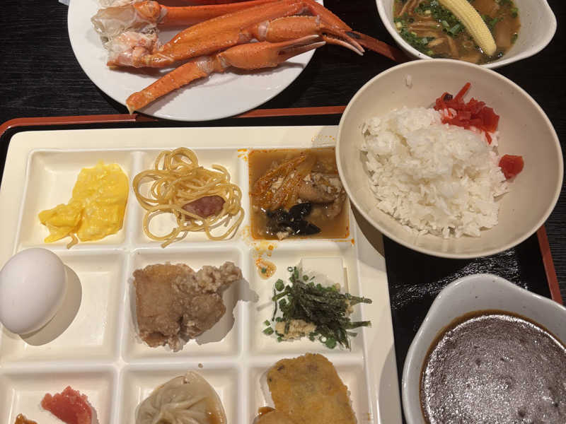 テンプレになりつつありますが、蟹その他食べ放題ビュッフェスタイル朝食(笑)ラーメンは豚骨醤油だったか