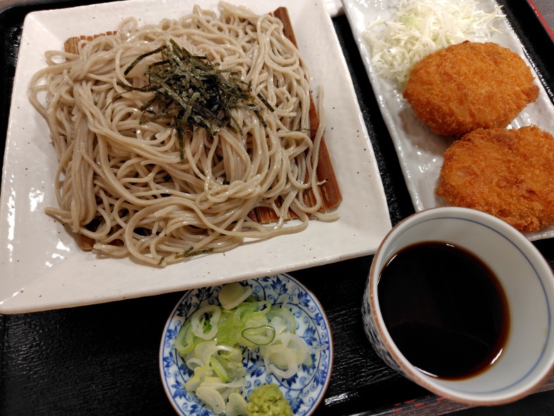 お店の石臼で挽いたお蕎麦が美味しい。 コロッケとともにいただきました。