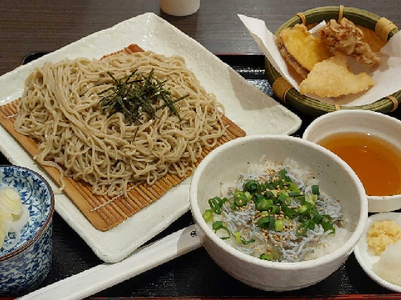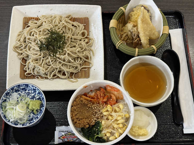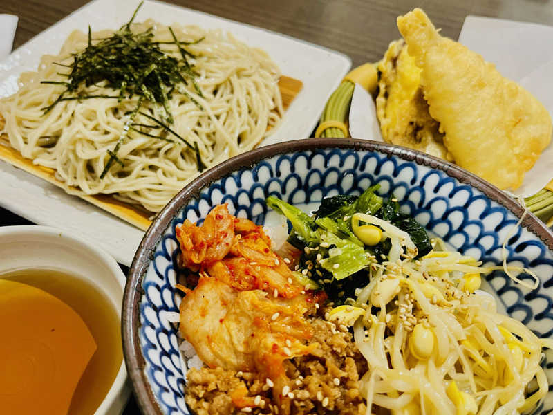 リニューアル前に食べときたい、と豪華版。冷たいお蕎麦と揚げたて天ぷら、ビビンバ丼で満腹、うま!