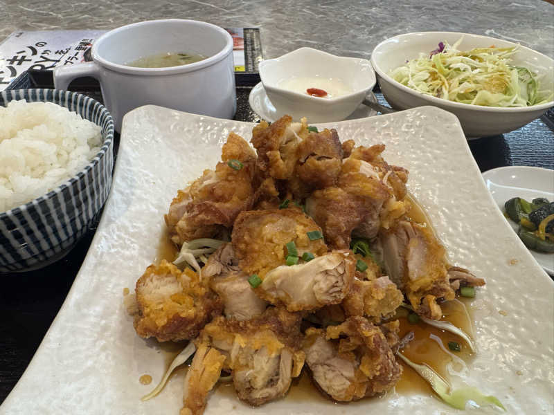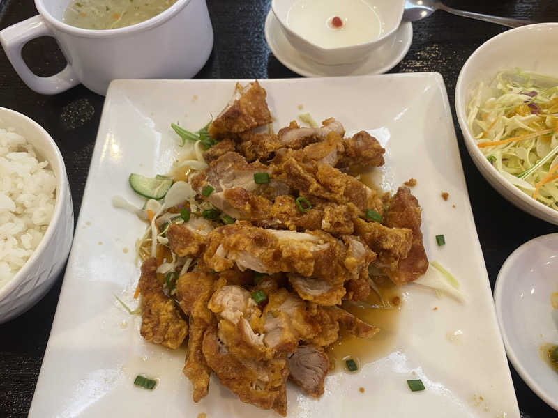 油淋鶏おいしい。定食の杏仁豆腐がクリーミー。