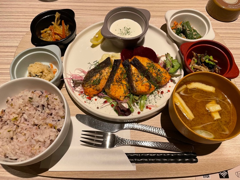 オーブンで焼き上げたサーモンが絶妙なおいしさ。ご飯何杯もいけるやつ。