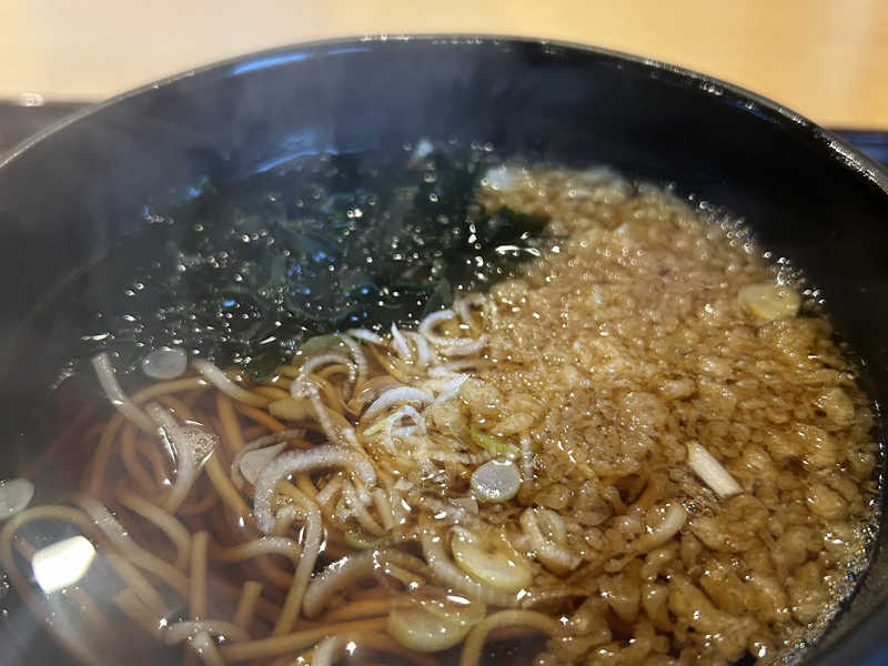濃いめのお汁、たっぷりの天かすとわかめ、もちもち麺