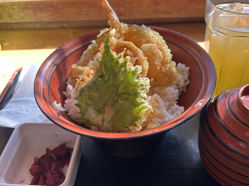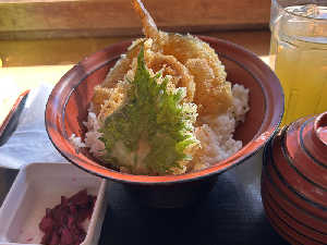 シソ天、ちく天、レンコン天?、カボチャ天、エビ天(甘エビ?) 写真より貧相に見える。甘エビ?細い。