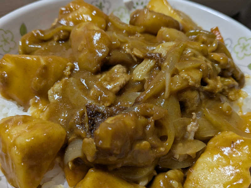 材料:じゃがいも、人参、茄子、豚肉こま切れ、ジャワカレー(中辛) 今日は、玉葱の代わりに茄子を使用