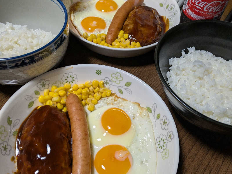 ハンバーグの他、ダブル目玉焼き・ウインナー・コーン添えました。コカ・コーラで妻と乾杯です😊