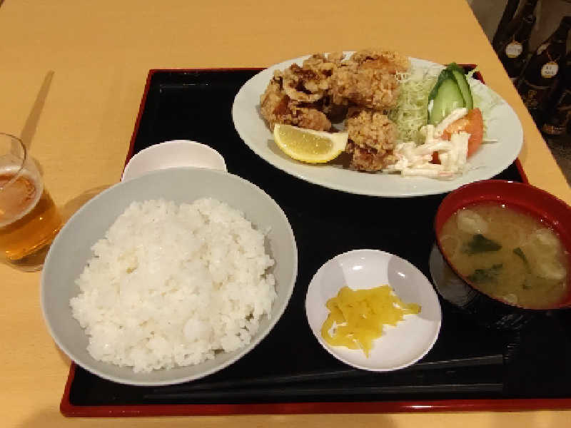 ノンアルを添えて。サクサクでジューシー。サウナセンターのメニューは全てが美味しい。