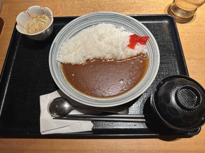 中辛くらいのカレー 味噌汁と小鉢がついていた。 サウナ前の腹ごなしにはちょうど良い量