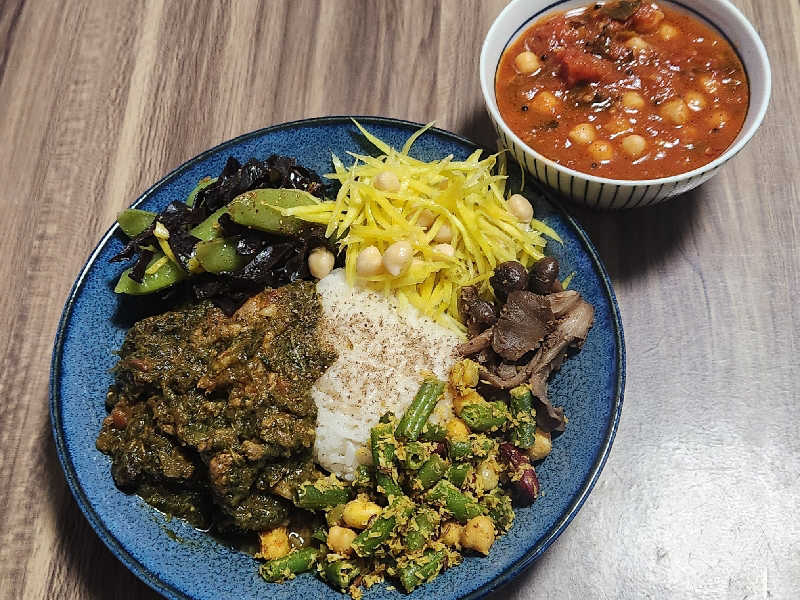 サグラム、ラッサ厶。アチャールはいんげん、きのこ、にんじんとひよこ豆、さやえんどうときくらげ。