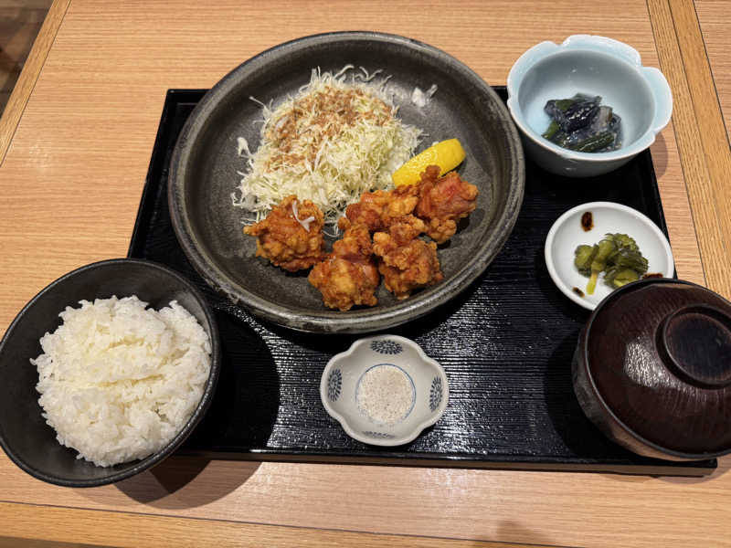 ポテト塩分多め。味変で卓上の一味かけると旨し