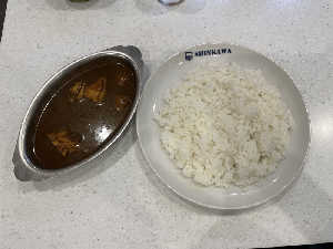 辛口のカレーですが、味わって食べられるレベルでした。皮付きの鶏肉とじゃがいも入りです