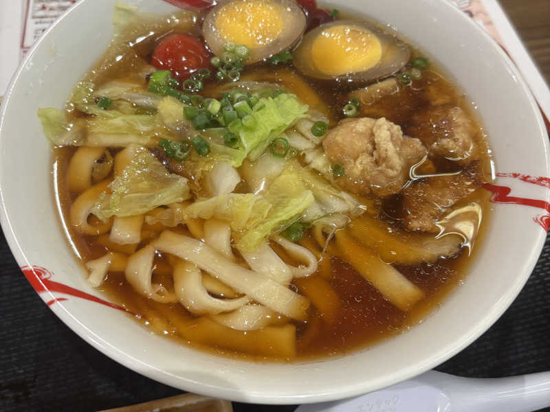 しょうゆベースのスープに、ほうとうの麺。ブロッコリーもよく合う。山賊焼と思ったら唐揚げだったが最高。