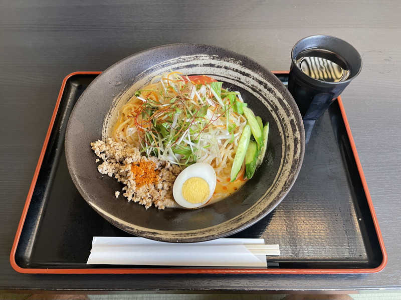 道産小麦の麺はモチモチで、野菜たっぷりのピリ辛冷やし担々麺😆美味しゅうございました✨