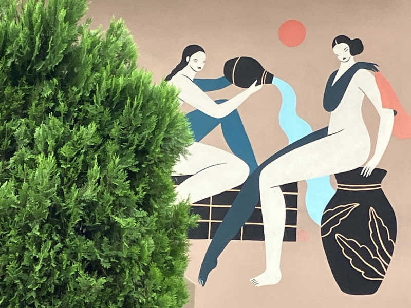 外壁に描かれた壁画には2人の女性が登場しており、片方が壺から水を分かち合う所作は、古代ギリシアの沐浴文化や「水の神聖性」を連想させる🏺