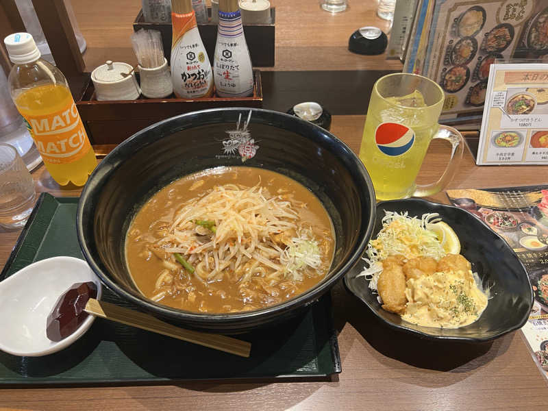 にんにく丸ごとあげたの入ってたぁーーー😳ほくほくしてカレーうどんピリ辛😋 タルタルソースうまっ😍