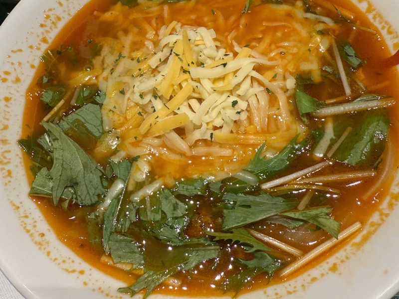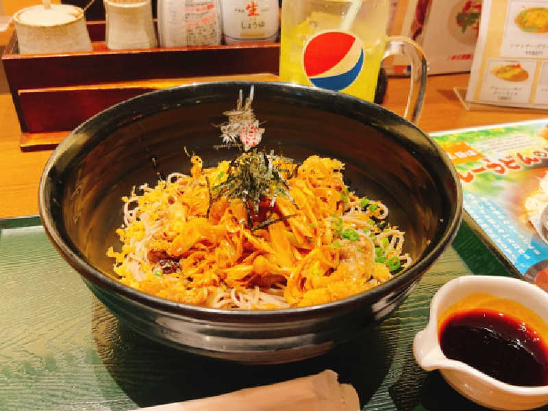 肉とお蕎麦の組み合わせが◎ 横にある辛いソースを入れすぎると、とんでもなく辛くなるため、注意❗️