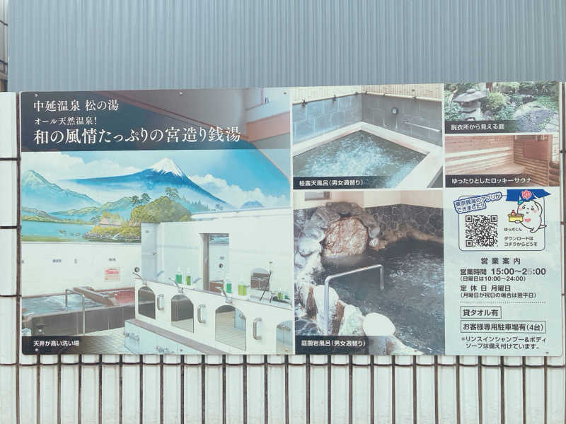 日本橋はしから電車🚃でアクセスの良いコチラに、日勤夜勤の間にご飯と風呂でリフレッシュしにきた。日本橋から地下鉄浅草線で一本、中延駅から出てすぐのところに宮造なのに鉄筋コンクリート風?漆喰仕上?の軒裏仕上に黄色いラインがトレードマークの建物が見えてくる。角の電柱がちょっと🤏邪魔って思うのは私だけ?サバンナ🦣高橋のサウナの神様の撮影🎥でも何度か使われていた。