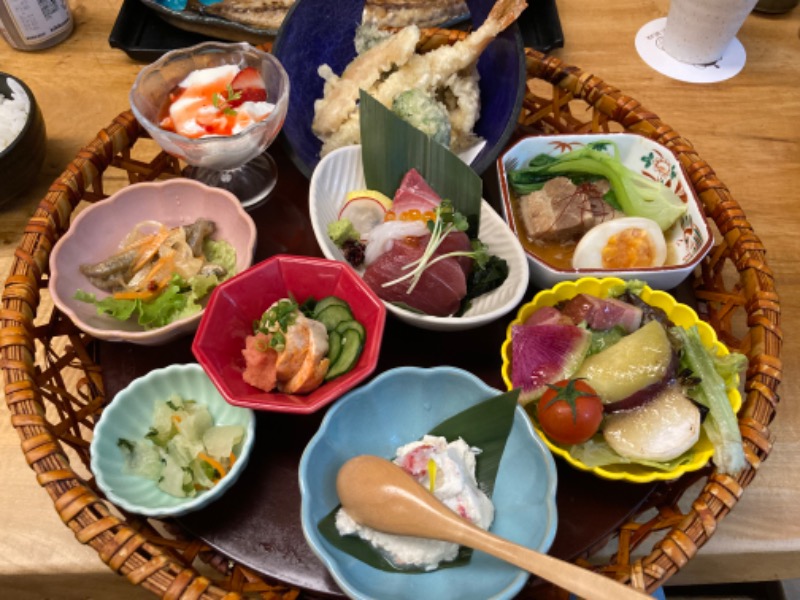 天麩羅、刺身、サラダ、豆腐、南蛮漬け、角煮、あん肝デザートと色々食べられてお得で美味い😋