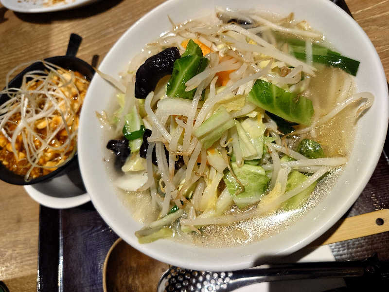 野菜炒めが上にのってる感じ。美味しいけど少し油っぽい。