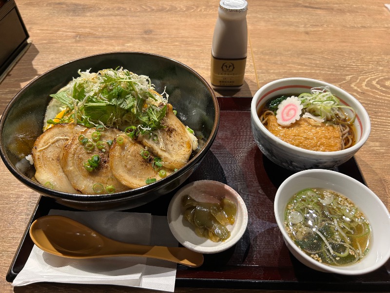 チャーシュー目玉焼き丼と冷やしきつねそばにミルクコーヒーを添えて
