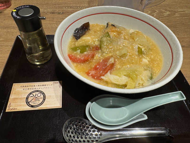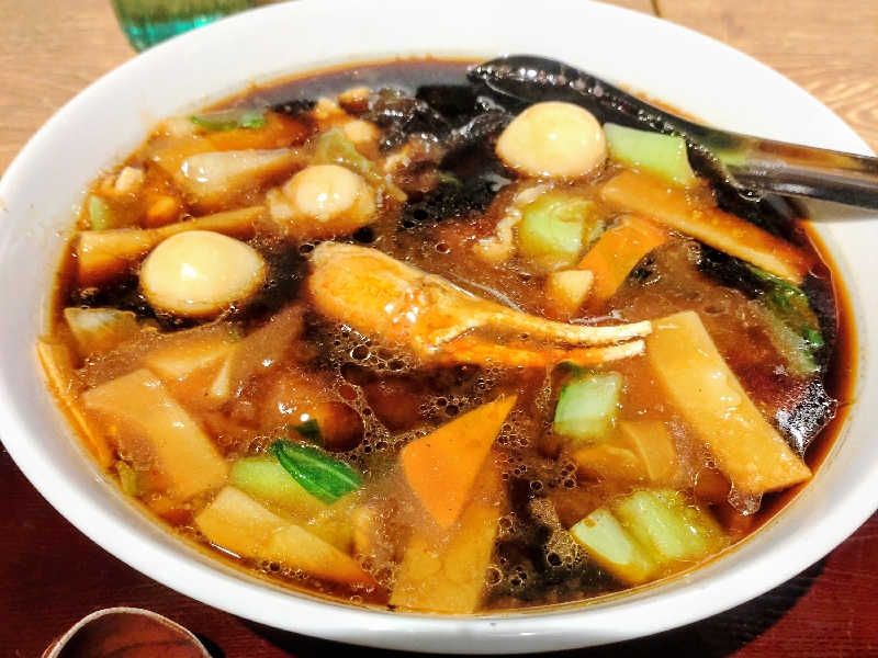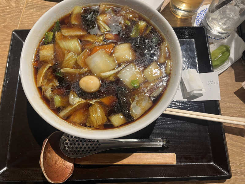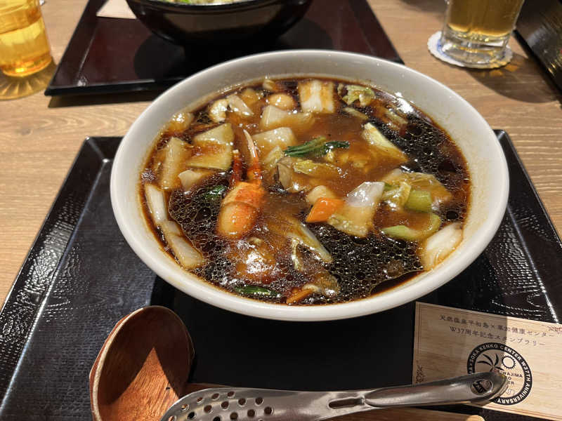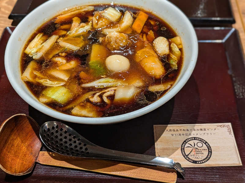 草加健康センターとのコラボメニュー 100年醤油ラーメンの上に、具沢山の海鮮あんかけがかかってます