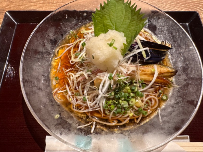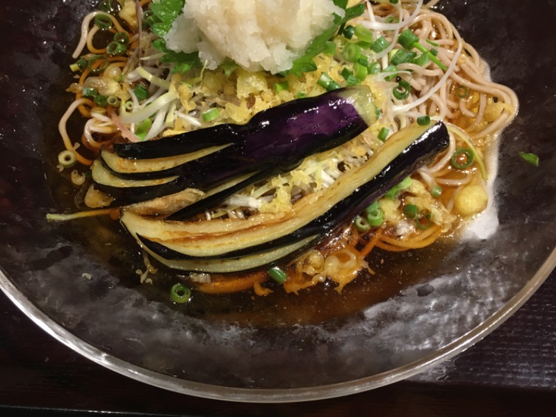 麺フェアのやつ! ミョウガなどの薬味と、揚げたて茄子とが一緒に重なって超美味かった!