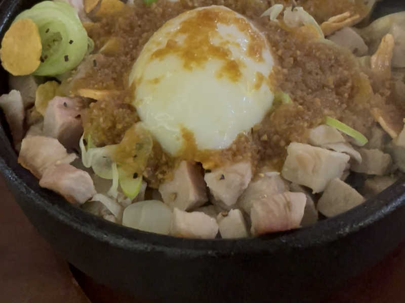 石焼の器でサウナストーンのようなポークにタレをかけて蒸気が立ち昇る。ガーリックのアロマが凄い。