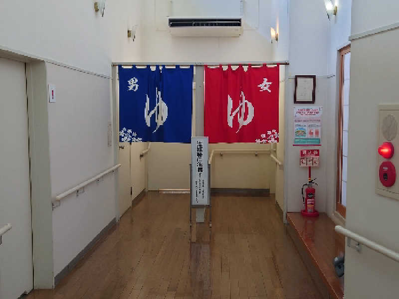 ひっそり佇む公民館風の建物の中を進んでいくと男湯暖簾が出迎えてくれる。