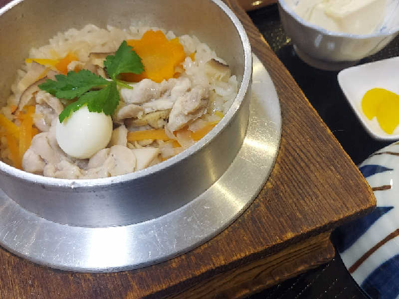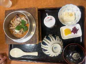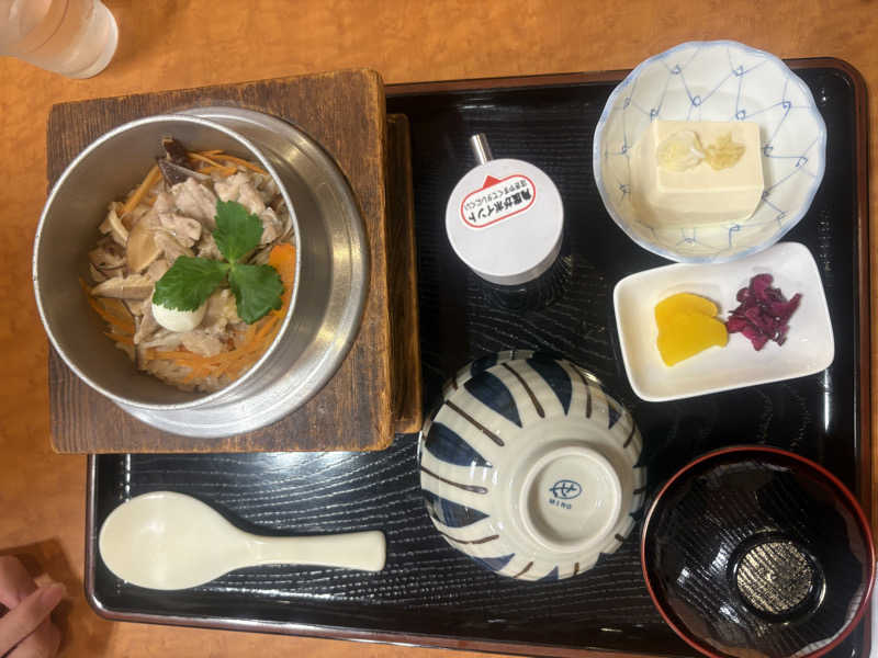 上の食堂で釜飯。 温泉釜飯は売り切れたので、鮭釜飯だが、美味い!