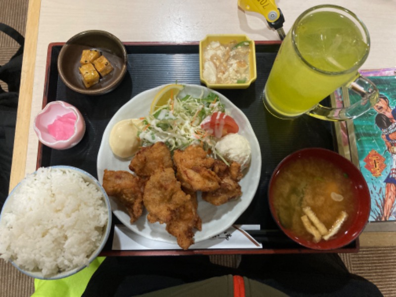 大きなから揚げが6個。ご飯はデフォルトで山盛り。今日は控え目な小鉢。
