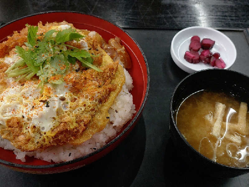 カツ丼しか勝たん! カツ丼は七味をかけるスタイル スモールサラダのきゃべつの千切りがキレイ