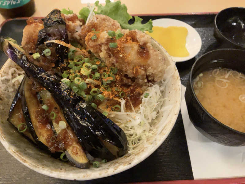 揚げナスと、ご飯の上に敷き詰められた千切りキャベツ、白髪ネギが嬉しい一品。美味しかったです。