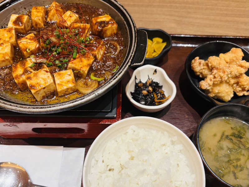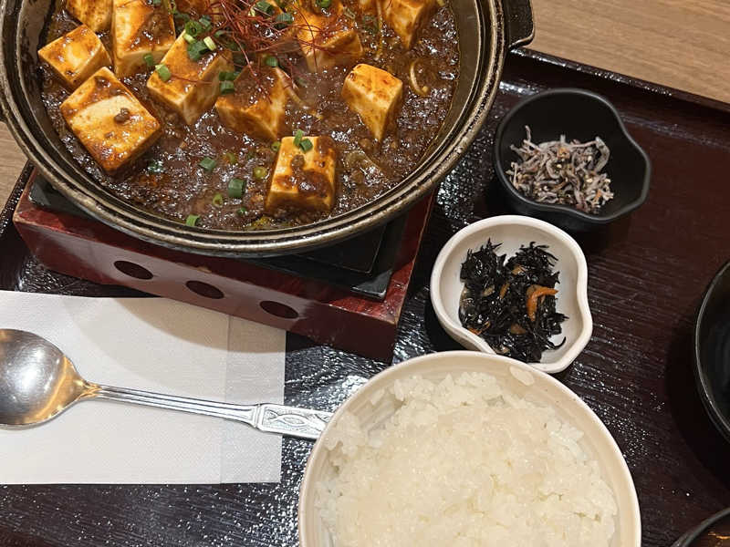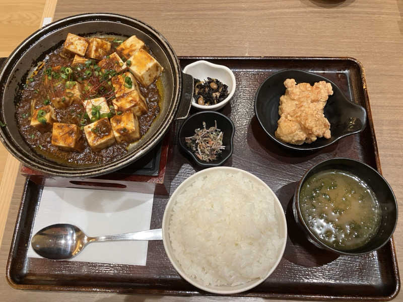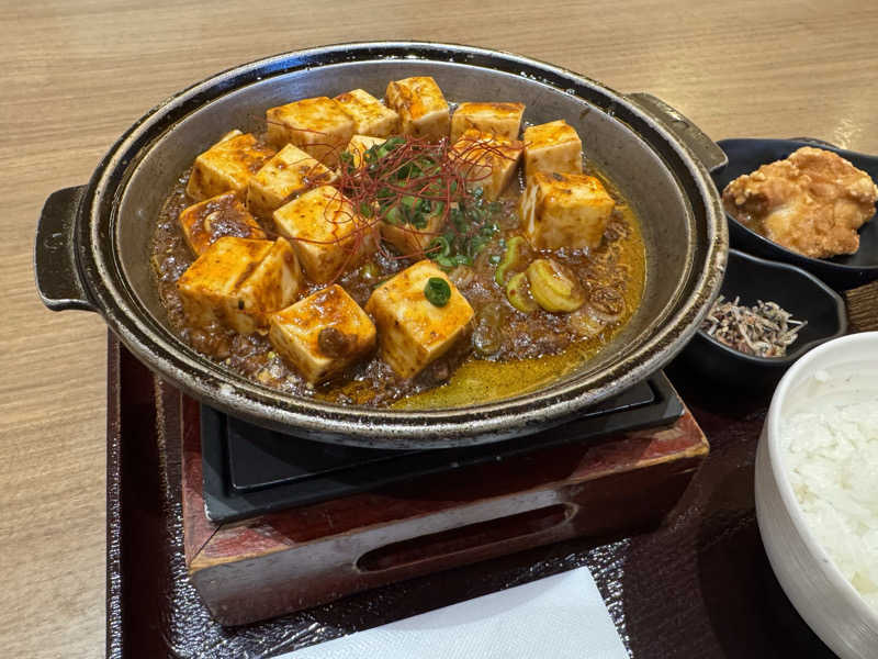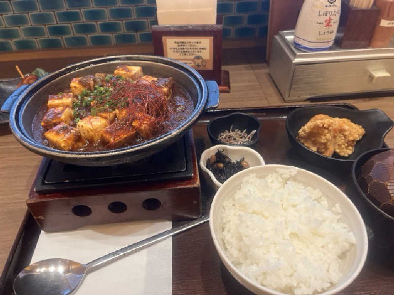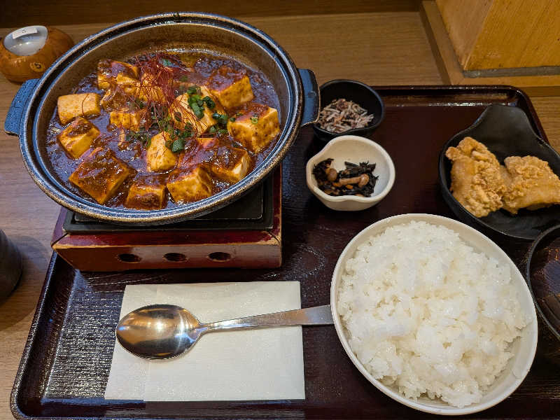 サウナ後に熱々の麻婆豆腐がこれまた美味い唐揚げとふりかけなんかもついてお得な感じです。