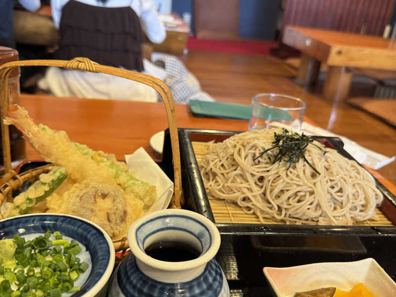 蕎麦は細麺の蕎麦感は少ないが冷えててちゅるちゅるイケる感じ!海老ぷりぷ他牡蠣フライ、モツ煮も美味しい